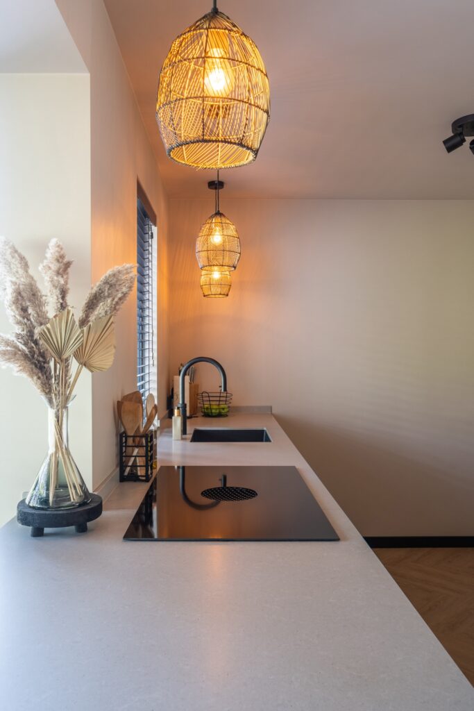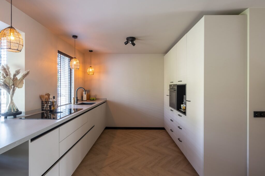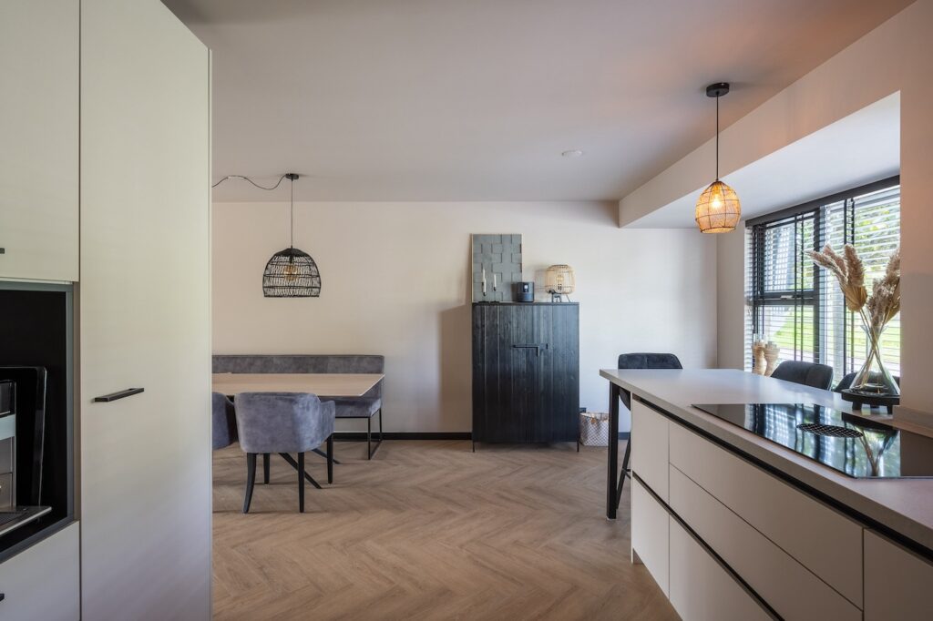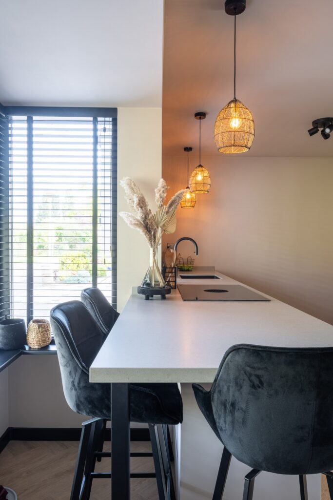 De keuken heeft een nieuwe, ruimtelijke opzet gekregen met een aangrenzende bar, waardoor koken en wonen op een natuurlijke manier in elkaar overlopen. Door de open indeling en de gekozen materialen oogt de ruimte licht, rustig en uitnodigend.