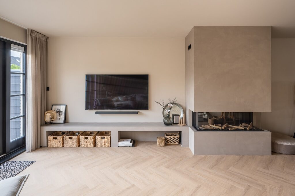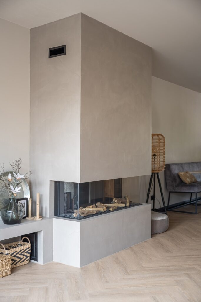 Een opvallend element in de woonkamer is het maatwerk haardmeubel. Deze vormt een centraal punt in de ruimte en draagt bij aan een warm en huiselijk gevoel, zonder afbreuk te doen aan de moderne uitstraling. De combinatie van rustige kleuren, natuurlijke materialen en strakke lijnen maakt deze begane grond tot een comfortabel en tijdloos geheel.