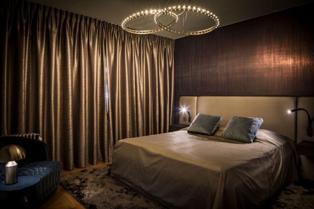 Ook de slaapkamer is volledig meegenomen in de renovatie. Door het gebruik van donkere kleuren, rustige materialen en subtiele verlichting is een evenwichtige en sfeervolle ruimte ontstaan die aansluit bij de rest van de woning.