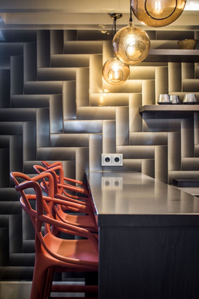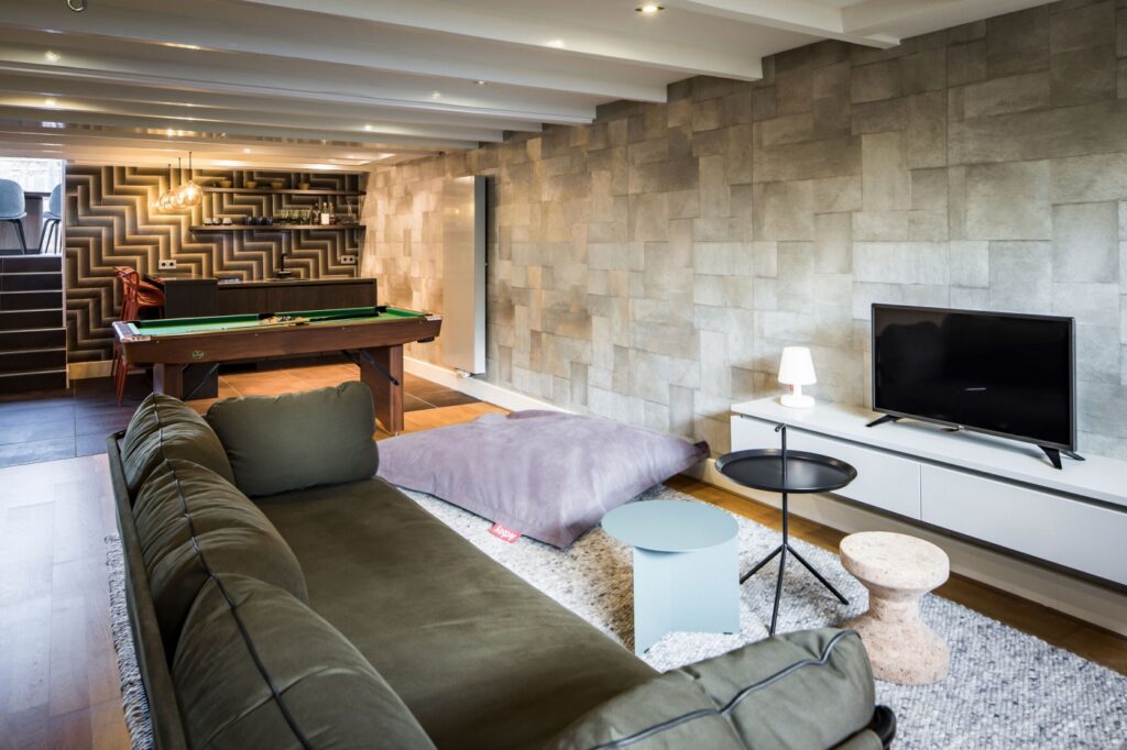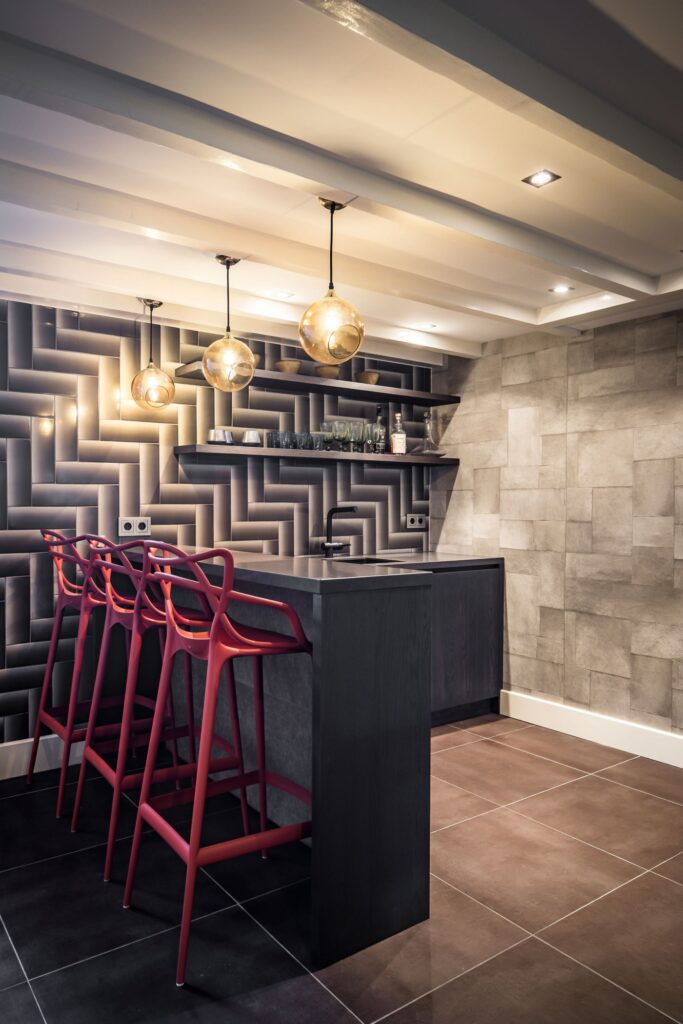 In de kelder is een bar met loungeruimte gerealiseerd. Deze ruimte is ingericht als volwaardige verblijfsplek, geschikt voor ontspanning en gebruik met gasten.